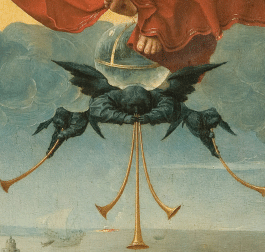 圖 4b: 相比較畫中實(shí)際所畫的5個(gè)喇叭,可以看到近紅外成像中有10個(gè)喇叭在大天使之下。畫中喇叭的位置似乎需要一個(gè)重新定位的帆船。地球儀上的腳趾的位置也與原始草圖的位置不同。圖像版權(quán)所有 by Detroit Institute of Arts。經(jīng)允許使用。