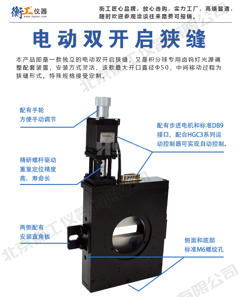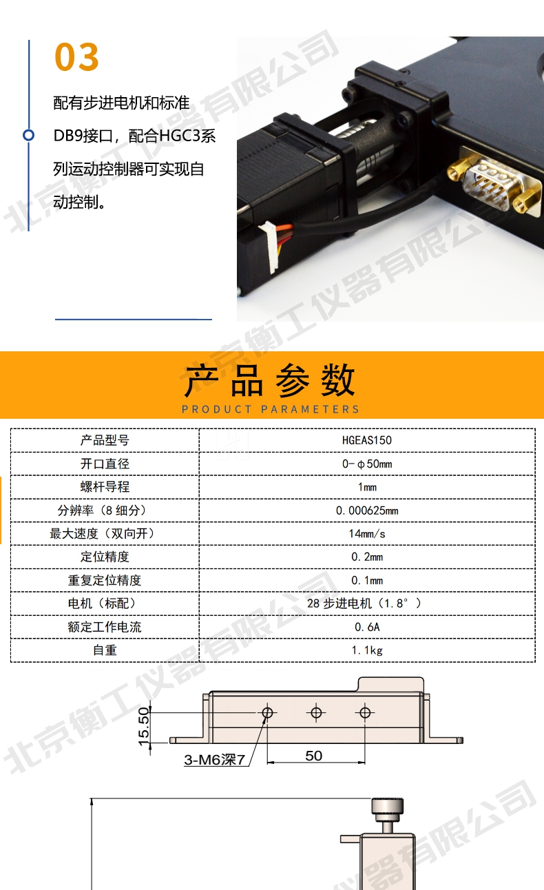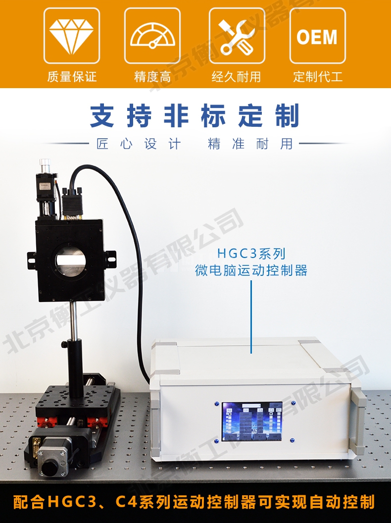 ● 配有步進(jìn)電機(jī)和標(biāo)準(zhǔn)DB9接口,配合HGC3系列運(yùn)動(dòng)控制器可實(shí)現(xiàn)自動(dòng)控制;