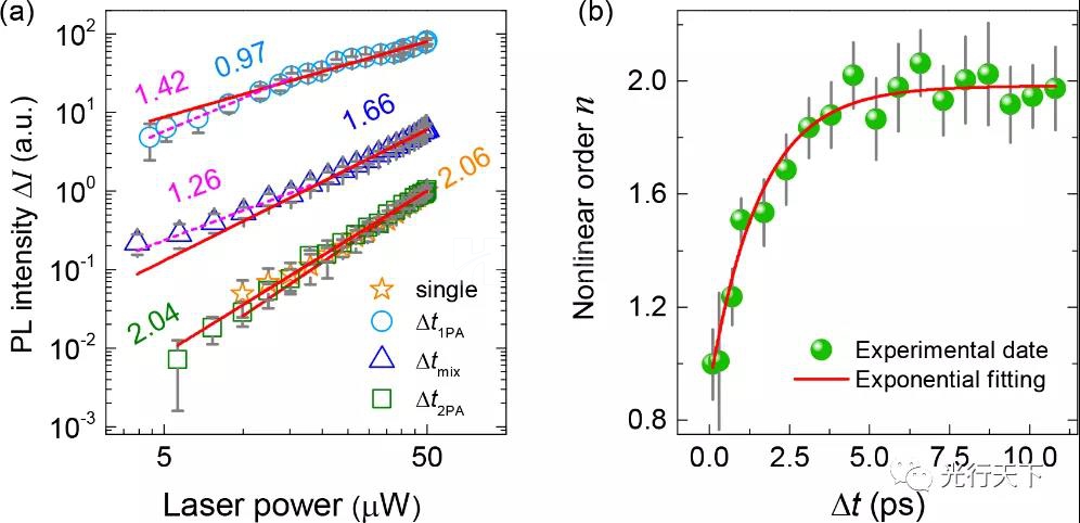 研究工作同時(shí)表明,通過(guò)精確調(diào)控兩束飛秒激光的延遲,可以精準(zhǔn)地調(diào)控飛秒激光與金納米粒子相互作用的非線性系數(shù)。如 圖2所示,使用單束飛秒脈沖激發(fā)金納米粒子時(shí),其熒光表現(xiàn)出明顯的雙光子吸收過(guò)程,非線性系數(shù)為2;在采用雙脈沖激發(fā)時(shí),當(dāng)僅改變其中一束飛秒激光功率時(shí),金納米粒子的熒光隨兩束脈沖延遲的增加呈現(xiàn)出從線性過(guò)程向雙光子過(guò)程漸變的奇異行為。在金納米粒子的實(shí)際應(yīng)用中,線性過(guò)程更適用于精密測(cè)量與傳感,而高階非線性過(guò)程對(duì)超分辨成像更有利。